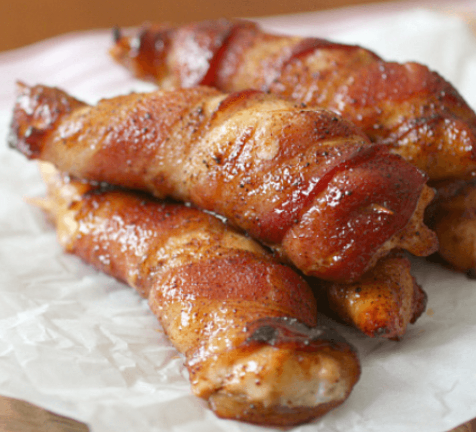 Bite-sized bits of chicken, dusted with brown sugar and chili powder, then wrapped in bacon, then dusted with brown sugar and chili powder again and baked in the oven!