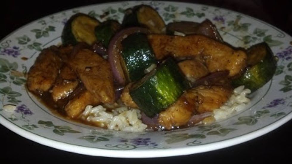 Tonight I made this with a pot of long grain brown rice, I added Zucchini, Red Onion wedges and Mushrooms to the Chicken and stir fried together, then served over the long grain brown rice. It turned out so good and it is really easy.