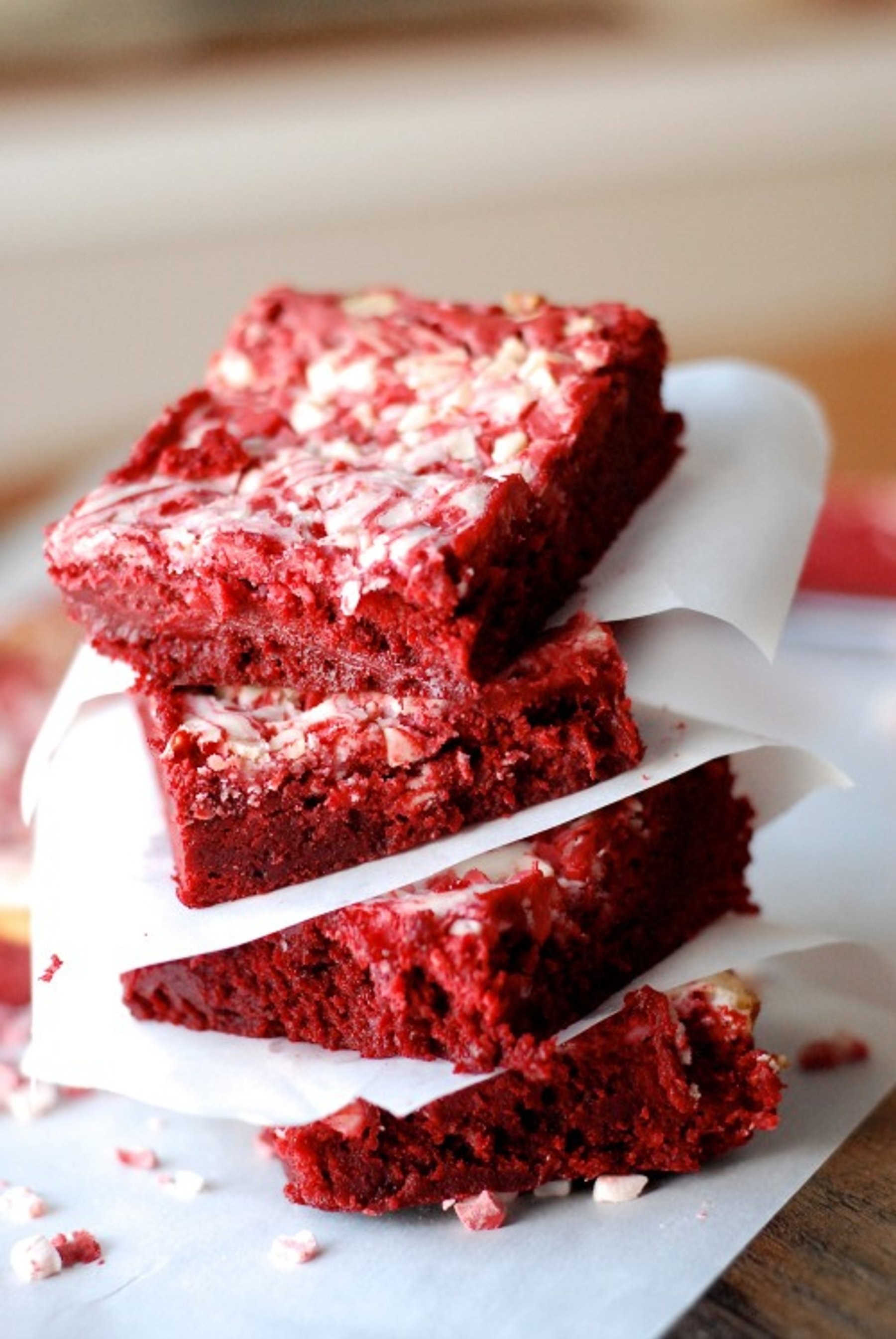 Red velvet brownies swirled with cream cheese and peppermint baking bits.