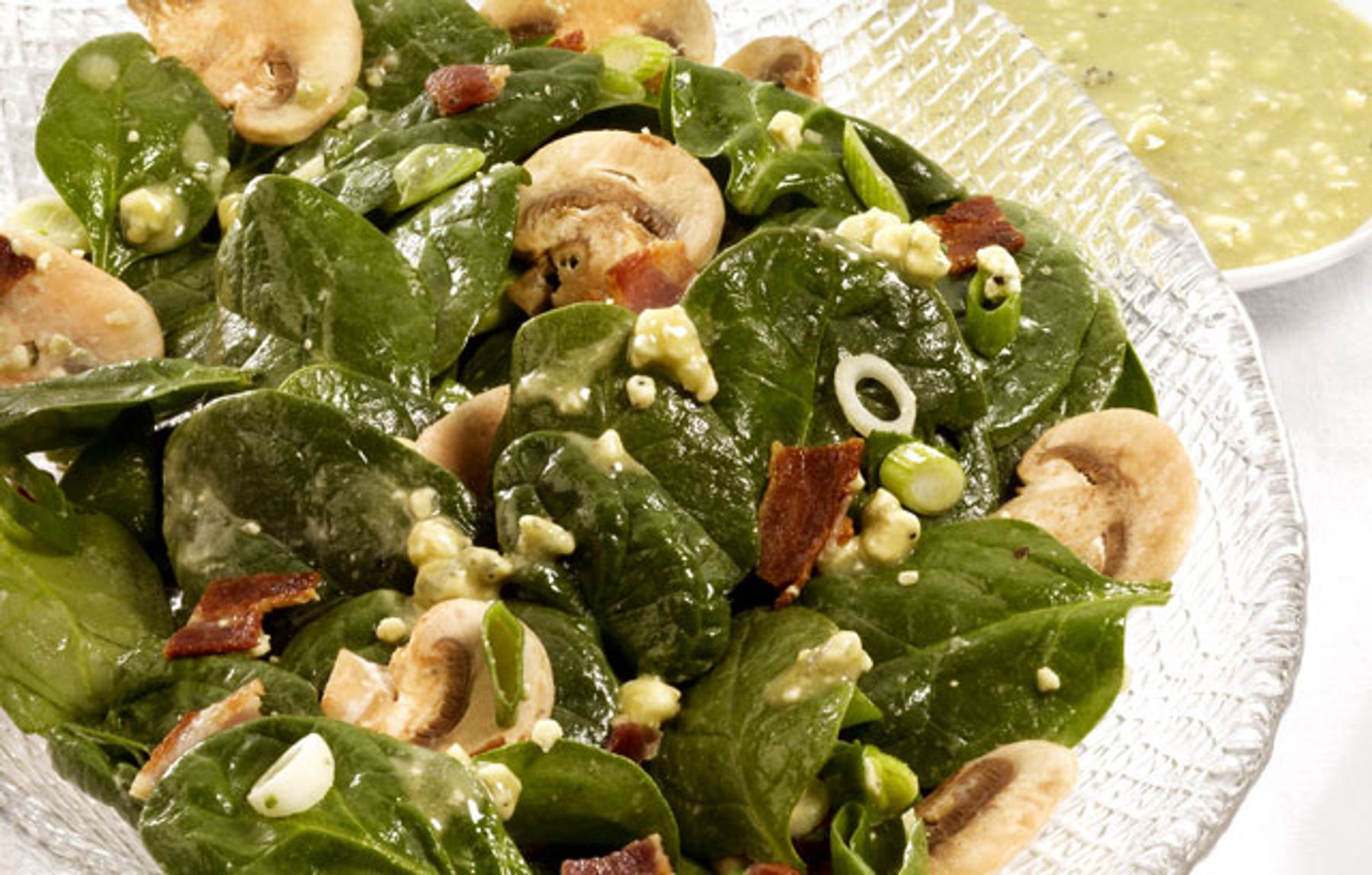 Blend all of the dressing ingredients together in a blender. Marinate mushrooms in dressing for 15 minutes. Combine all of the ingredients for the salad and toss with dressing just before serving to prevent wilting.
