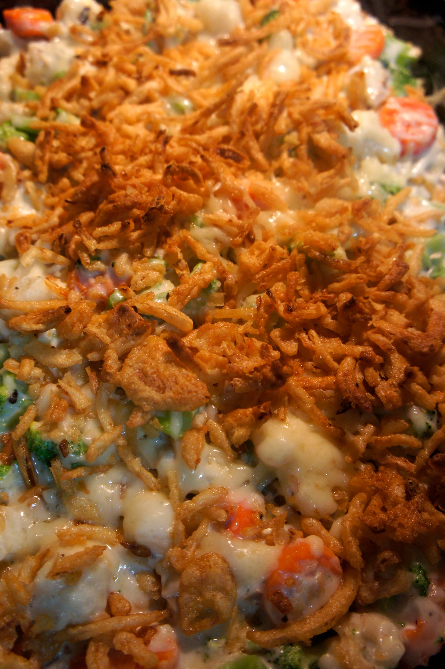 In a large bowl combine the vegetables, soup, sour cream, pepper, 1/2 cup cheese and 1/2 can onions. Pour into a 1 quart casserole dish. Bake covered for 30 minutes. Uncover and top...