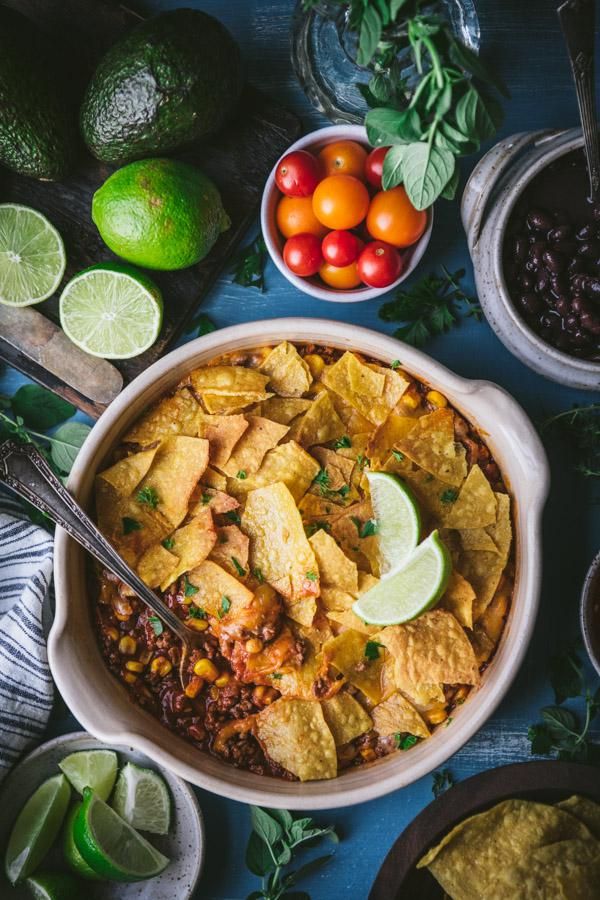 All of your favorite taco ingredients come together in one dish with this easy Taco Bake Casserole! The family-friendly combination of seasoned ground beef, corn, cheese and tortilla chips in a tomato-based sauce is flavorful, simple, and ready in just 30 minutes. Serve the cheesy taco casserole with pico de gallo, rice, beans, a simple green salad, or some extra chips, salsa and guacamole on the side. It's a perfect weeknight dinner!