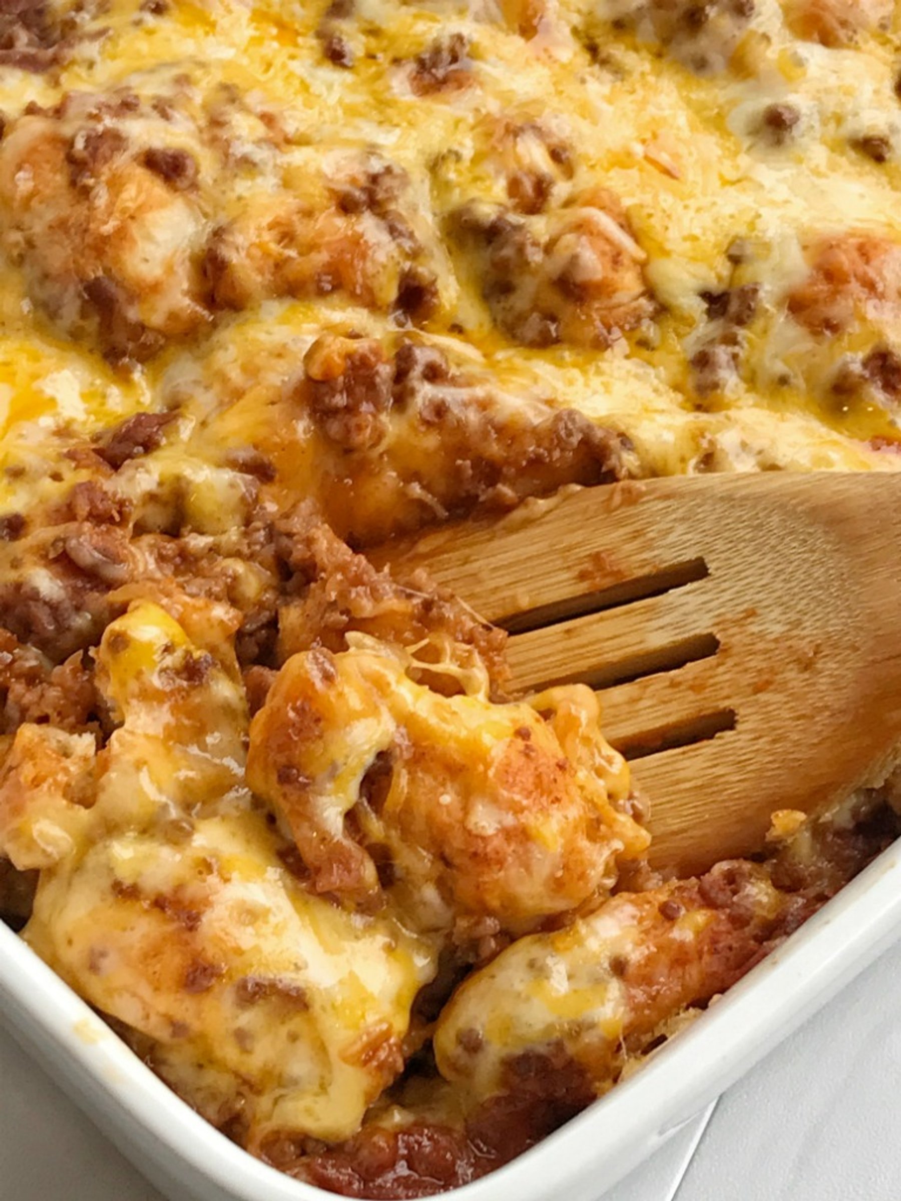 Taco biscuit bake is an easy & simple one pot meal. Puffed up refrigerated biscuits smothered in a beefy taco mixture and topped with melted cheese. Customize with your favorite taco toppings and you have a delicious dinner that the entire family will love!