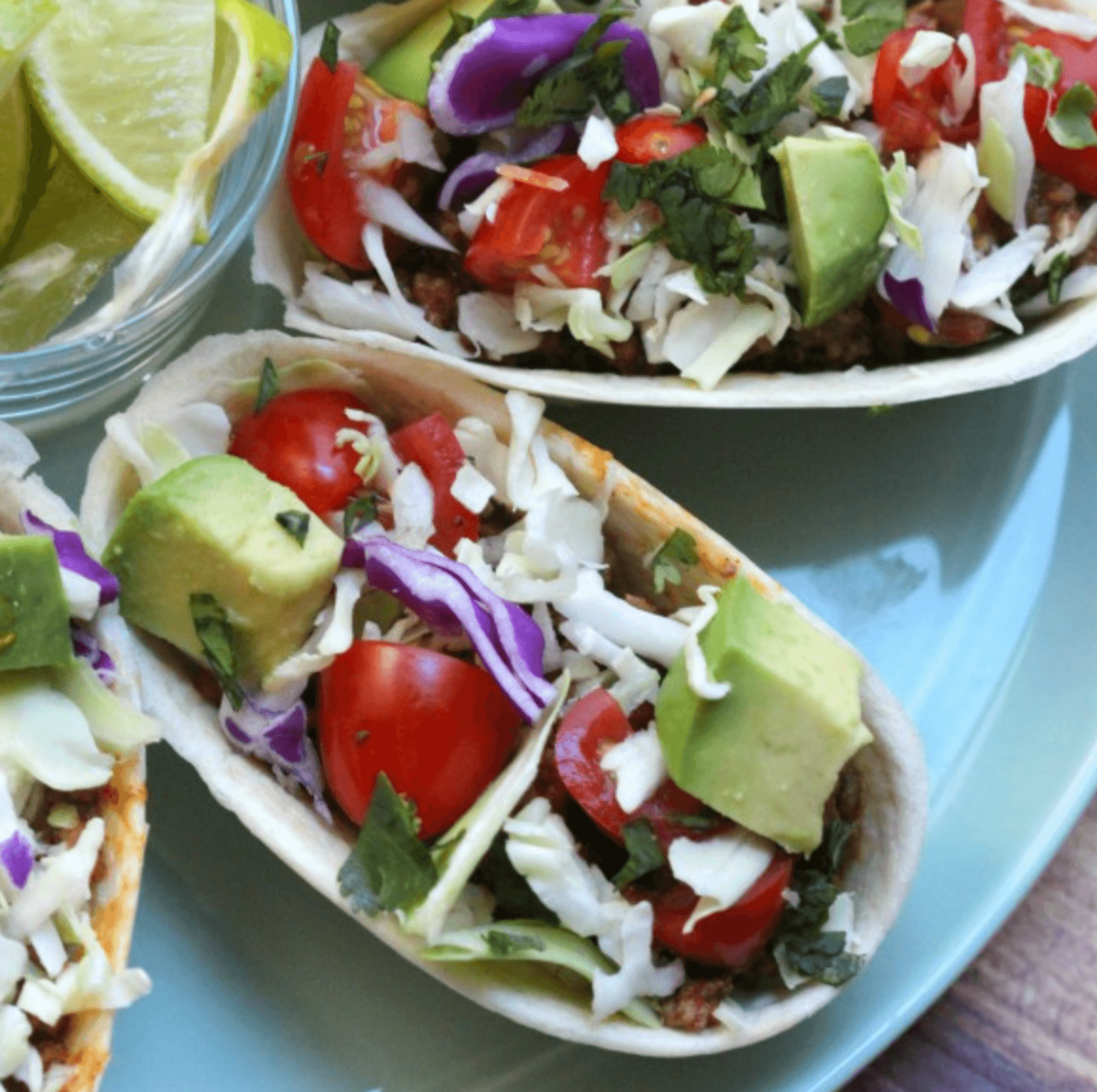 Fill the taco boat with beef half way - add tomatoes, cabbage, cilantro, avocado, juice slice of lime on top