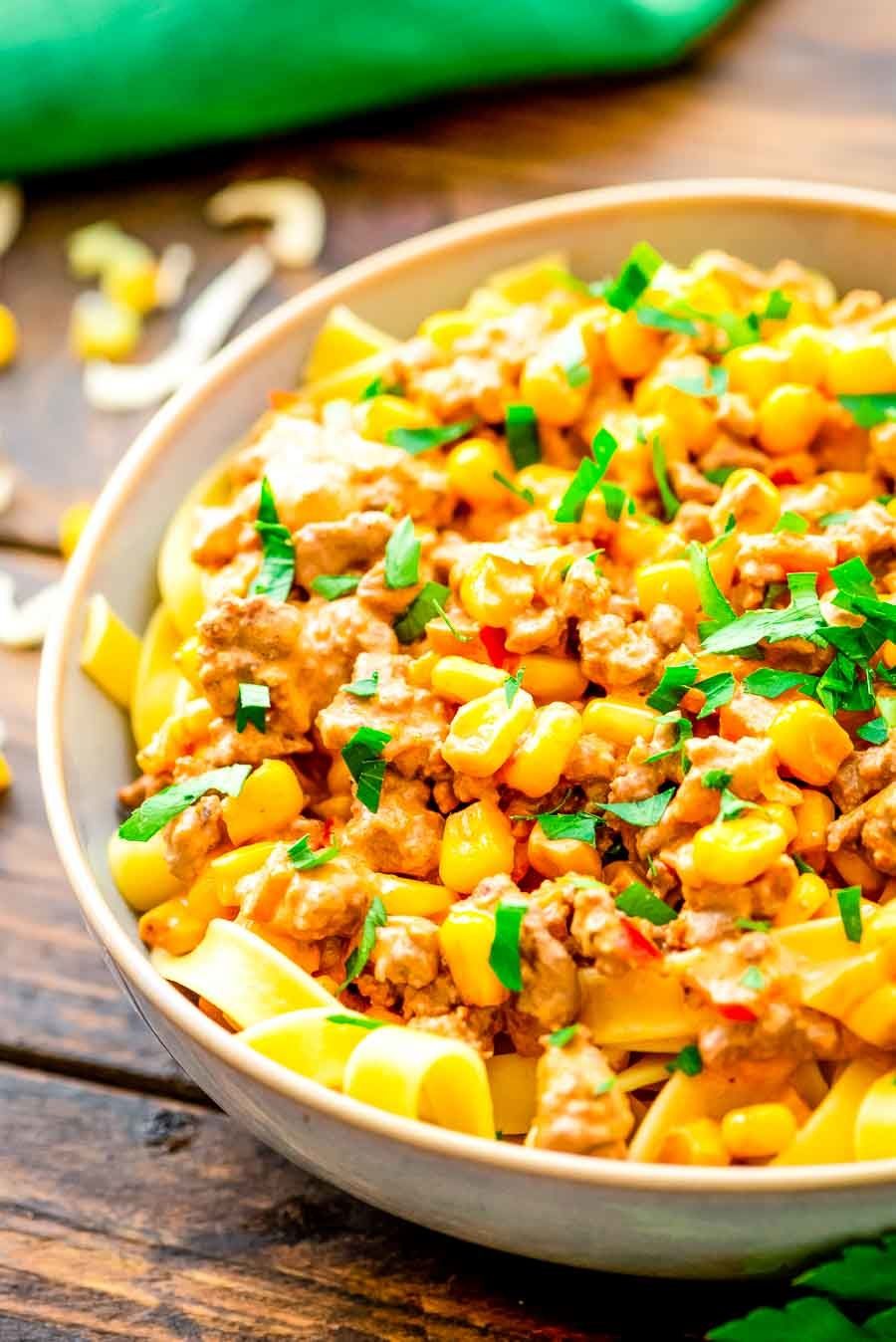 Taco Stroganoff is a spin on our popular Hamburger Stroganoff recipe! This is the perfect quick and easy meal for your family on busy nights. It has a ton of flavor from the seasoned taco meat and corn. Plus, it's extra creamy from the secret ingredient, cream cheese! It's served over traditional egg noodles.