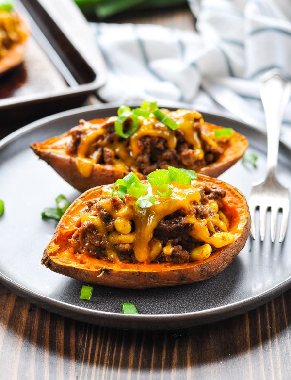 A family-friendly healthy dinner recipe is ready in about 30 minutes with these delicious Taco Stuffed Potatoes! Whether you use sweet potatoes or russet potatoes, ground beef, turkey or chicken, everyone will love this easy make ahead meal!