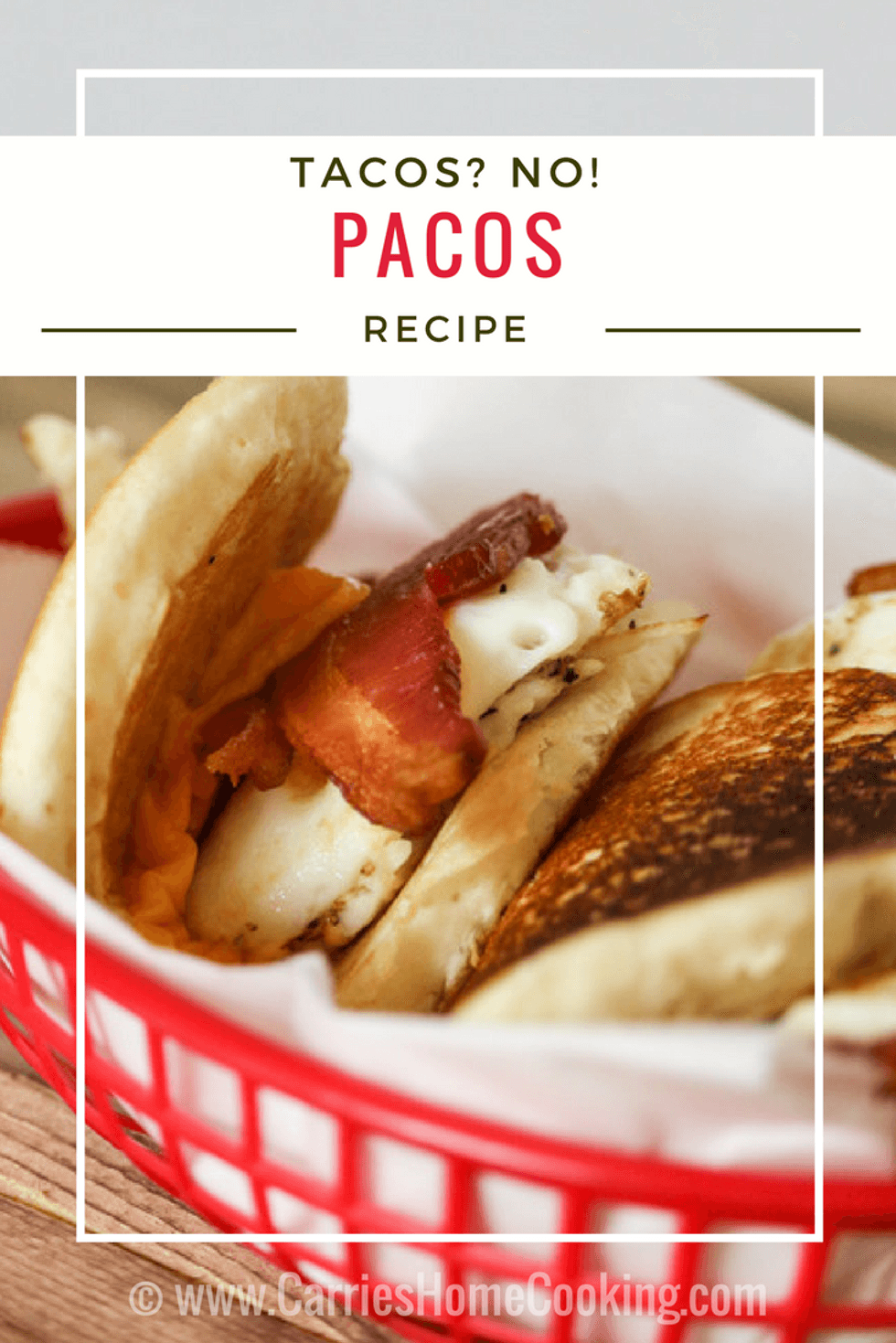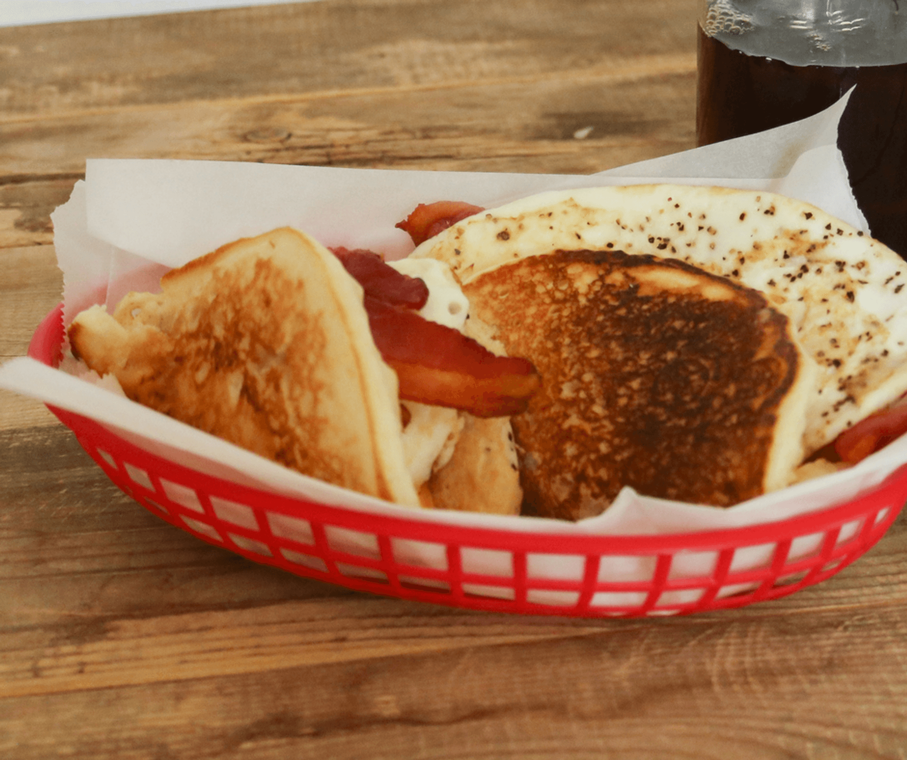 A grab and go food truck style breakfast. A pancake for a taco shell filled with thick cut crisp bacon, fried eggs and cheese!