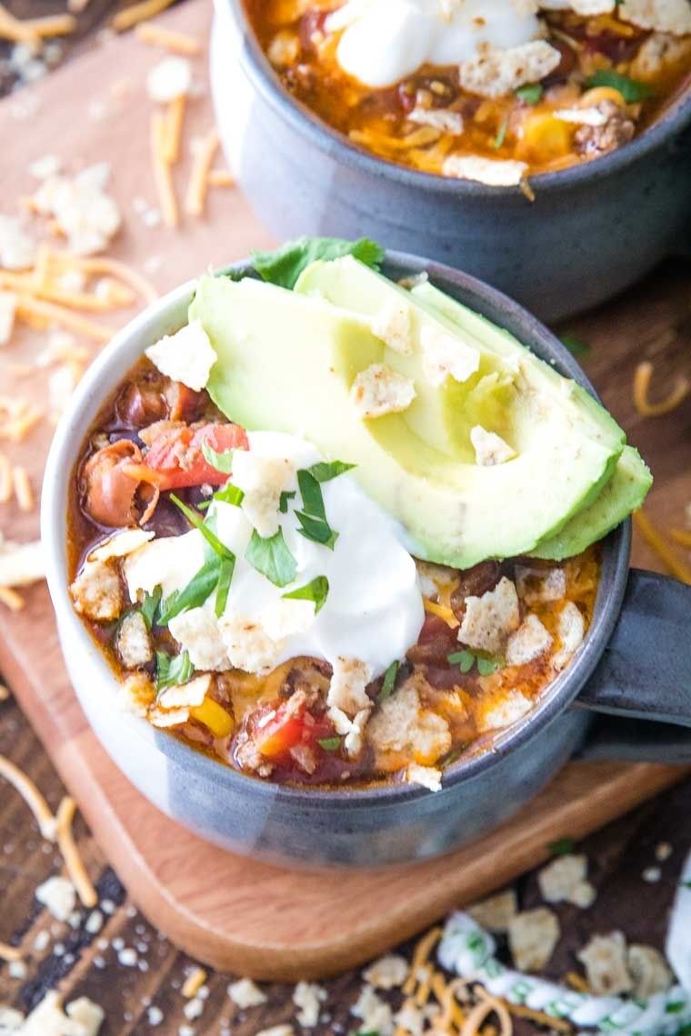 Looking for a quick and easy soup recipe that is bursting with flavor? Then you have to make this Taco Soup! The best part about this soup recipe is that it's ready in about 30 minutes. Warm up to a big bowl of it for dinner, meal prep it for lunch that week or freeze it for a quick and easy freezer recipe. It's loaded with ground beef, onion, corn, peppers, beans, tomatoes and seasonings. I love that it's a healthy recipe too! Personally, I love topping it with cheese, salsa or sour cream!