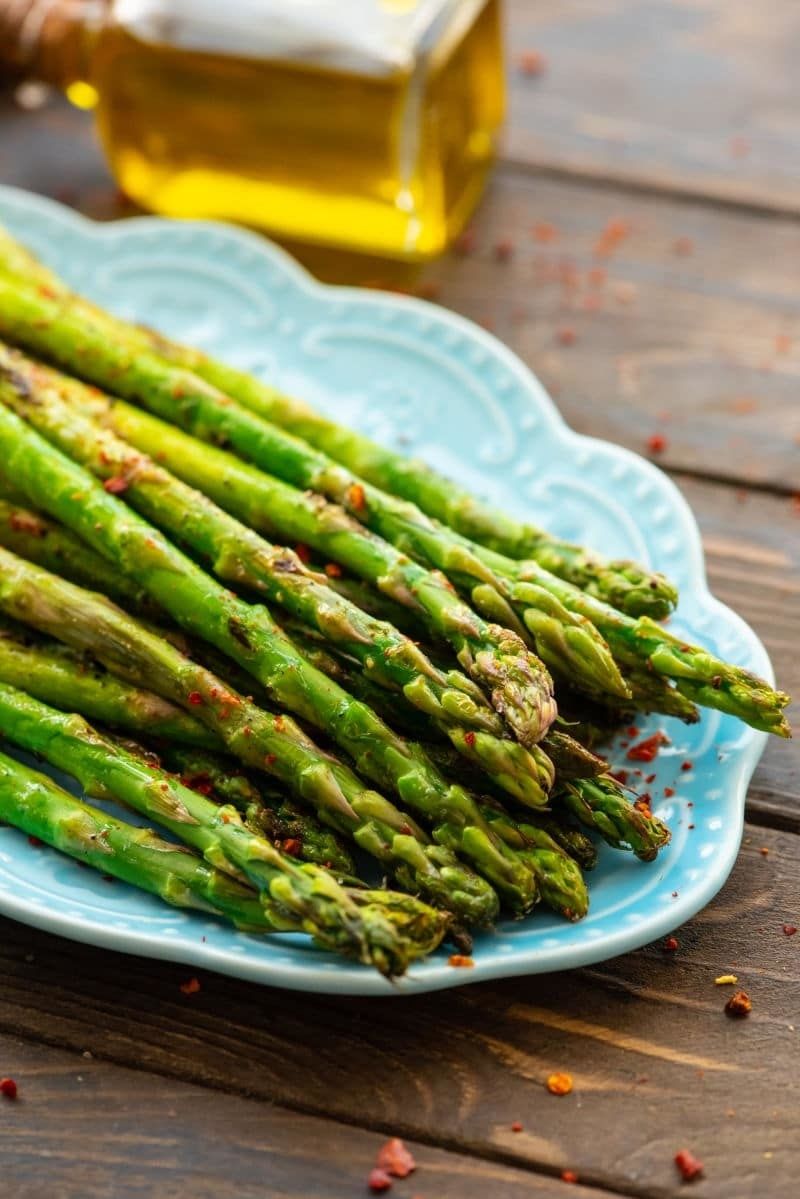 - Coat asparagus with olive oil, garlic salt and pepper.