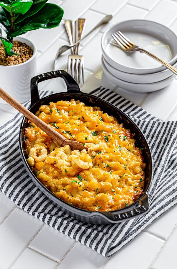 Southern baked macaroni and cheese is always made from scratch. And it must be made well, with love and respect. Recipes feature at least 3 to 5 different cheeses. Some recipes include cream cheese, mozzarella cheese, Gruyere, or smoked gouda. The only acceptable noodle: elbow macaroni.