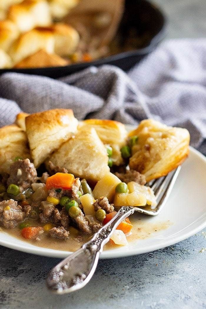 This Easy Skillet Beef Pot Pie Recipe is the ultimate comfort food dinner recipe made easy! It’s filled with ground beef and vegetables in an easy homemade gravy and topped with biscuits. Plus, it’s made in one skillet! It’s sure to be a hit with the whole family!