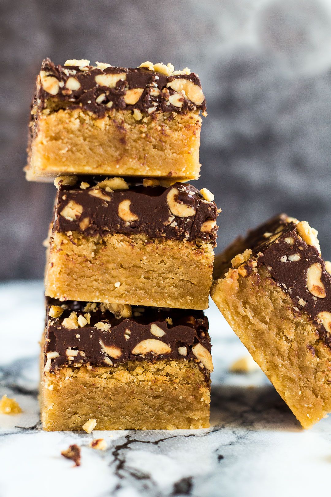 Deliciously fudgy blondies loaded with peanut butter, and topped with a salted peanut chocolate layer!
