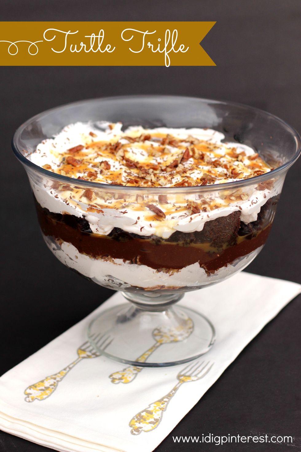 Layers of chewy, fudgy brownies, chopped pecans, caramel and chocolate topping and cool whip make this Turtle Trifle oh-so-decadent and completely irresistible! It's a must make!