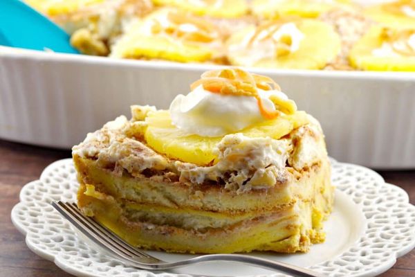 This easy Overnight French Toast Casserole is made with healthy eggs, pineapple, walnuts and pureed carrots (in the form of baby food so it's quick and easy to make) but still tastes like you're eating cake for breakfast!