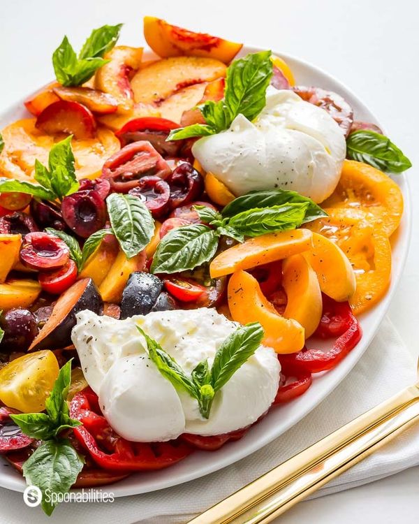 Stone Fruit Caprese Salad is a summery dish made using fresh, seasonal heirloom tomatoes, colored cherry tomatoes, and stone fruits like cherries, nectarines, peaches, apricots, and plums. Topped with creamy burrata cheese and basil, this wonderful recipe is seasoned with FIVE extra virgin olive oil and sea salt.