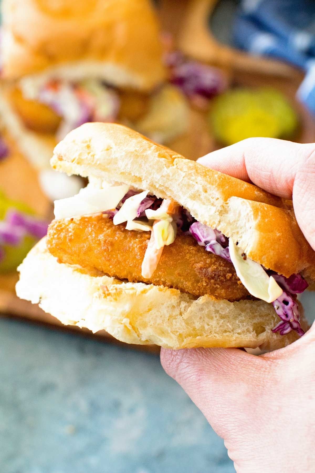 Fish Sandwich with Garlic Aioli Coleslaw ~ Delicious Fish Sandwich on Toasted Bun! Piled High with Homemade Coleslaw in a Garlic Aioli Sauce. Perfect for a Quick Weeknight Night Dinner Recipe Especially During Lent.
