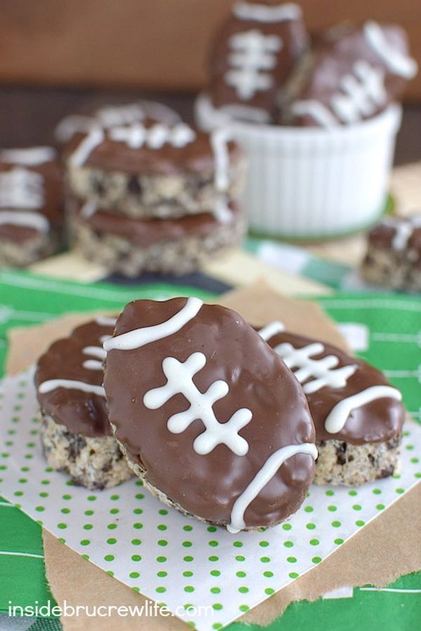 Mint cookies and mint chocolate make these football shaped rice krispie treats a game winning treat!