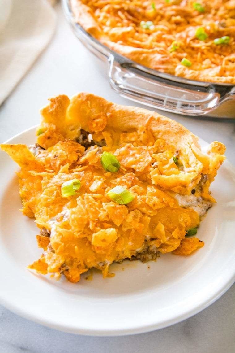 This delicious Taco Pie with crescent rolls recipe is made with a crust of crescent rolls then piled high with seasoned taco meat, sour cream, cheese and Nacho Cheese Chips. Taco Pie with Crescent Rolls is a recipe the entire family will love for dinner!