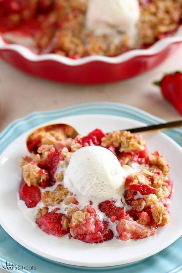 This quick and easy strawberry crisp is full juicy strawberries and topped with a buttery brown sugar oat crumble. This delicious fruit crisp dessert comes together in minutes and is sure to be a crowd pleaser. Grab those fresh strawberries and make it today!
