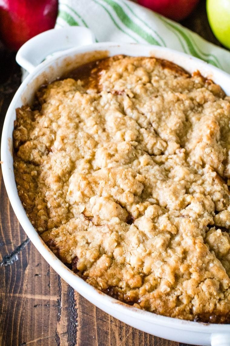 This quick and easy apple crisp recipe is full of juicy apples, cinnamon, sugar and the best part of all is the amazing oatmeal streusel on top! Grab your ice cream, warm apple crisp and dig into this easy dessert!