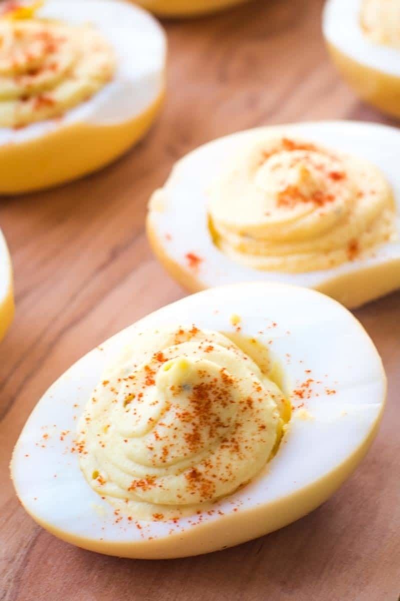 - Separate yolks from whites. Place yolks in medium sized container. Mash them and add in mayo, vinegar, dry mustard, yellow mustard, sweet onion, salt, pepper and paprika.