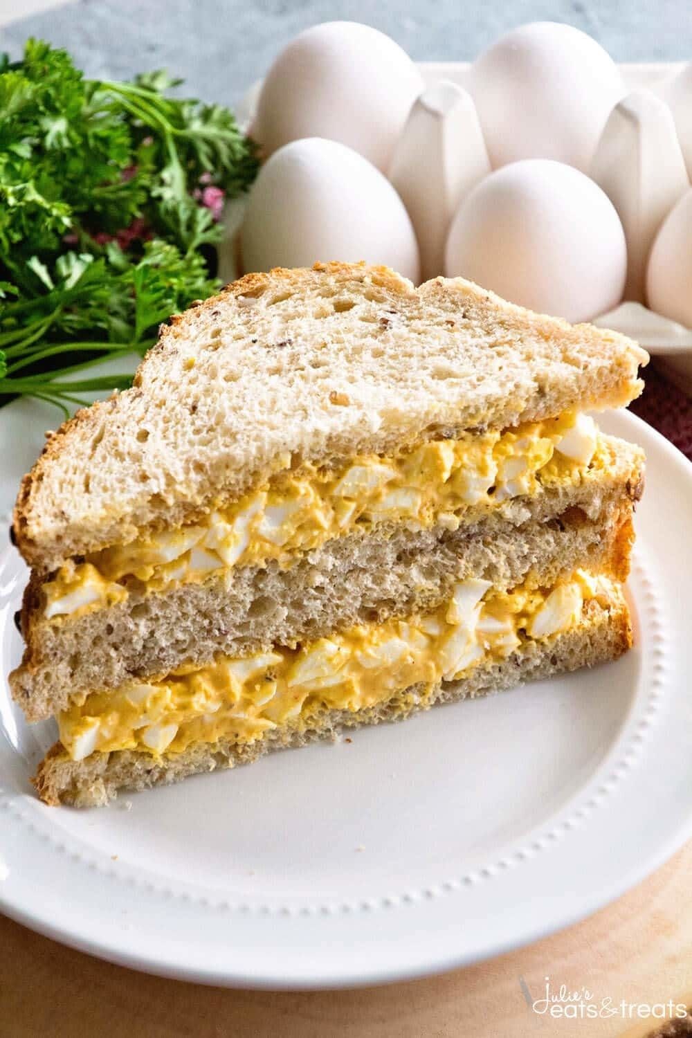 Deviled Egg Salad Sandwich is the perfect recipe for using leftover hard boiled eggs up! This classic egg salad recipe is made with hard-boiled eggs, mayonnaise and just the right amount of mustard and spices. You might skip the bread and eat this with a spoon! Learn how to make the perfect homemade egg salad sandwich that everyone will love!