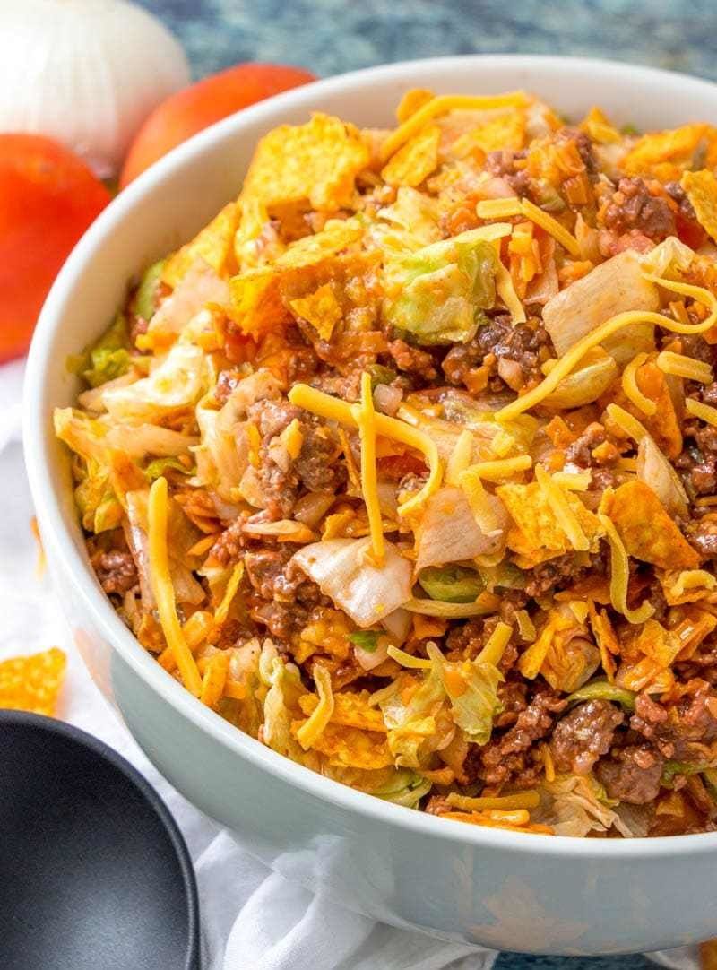 The perfect Taco Salad for a potluck or party! This Doritos Taco Salad is always a hit anywhere I bring it and we’ve been serving it my entire life. It’s loaded with ground beef, cheese, lettuce, tomatoes, onions and Nacho Cheese Doritos for the perfect crunch!