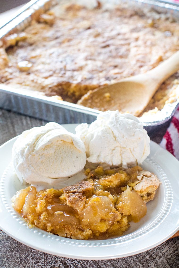 - Spray a 9'' x 13'' foil pan with non-stick spray. Dump apple pie filling into foil pan. Sprinkle cinnamon on top of pie filling. Top with cake mix make sure it's...