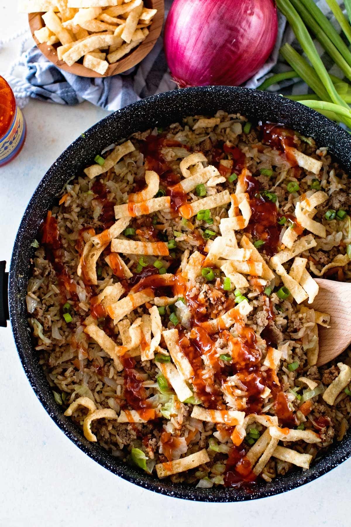 - In a large skillet over medium-high heat cook and crumble chicken or beef, onion, and garlic. Heat until no longer pink 6-8 minutes; drain off grease. Stir in soy sauce and ginger.