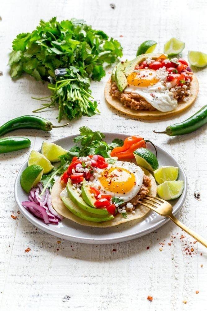 HUEVOS RANCHEROS is a delicious Mexican breakfast recipe! This easy vegetarian recipe features beans, eggs and pico de gallo on top of a warm corn tortilla.