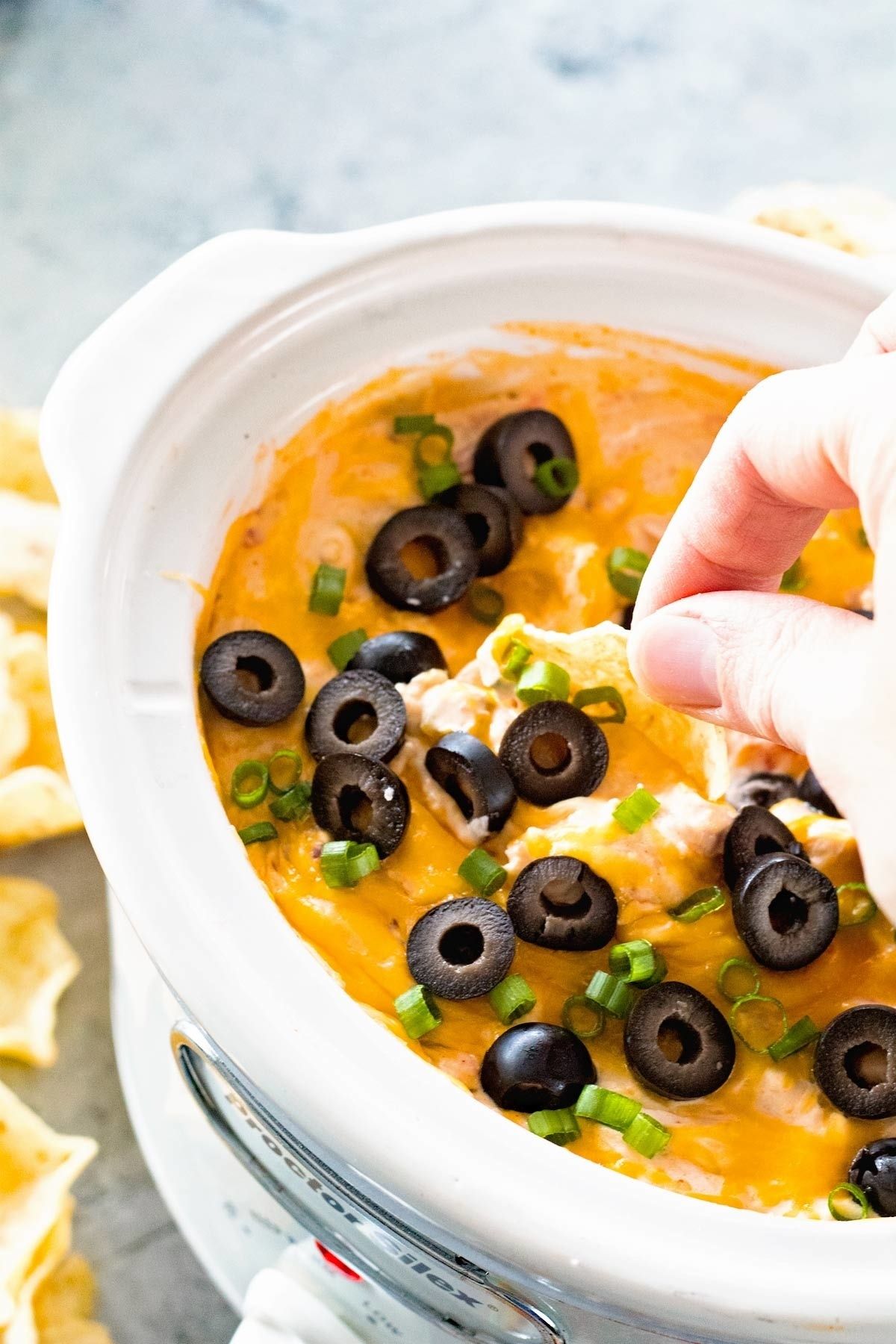 Crock Pot Chicken Enchilada Dip ~ This Easy Slow Cooker Chicken Enchilada Dip is so Cheesy and Amazing! The Perfect Easy Dip Appetizer for Your Parties!