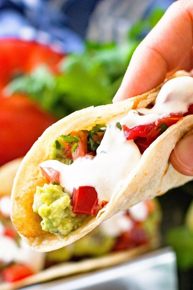 Crispy corn tortillas, crunchy fish sticks, layers of guacamole and Pico de Gallo topped with Lime Dressing make these easy Mexican Fish Stick Tacos a quick and easy dinner recipe!