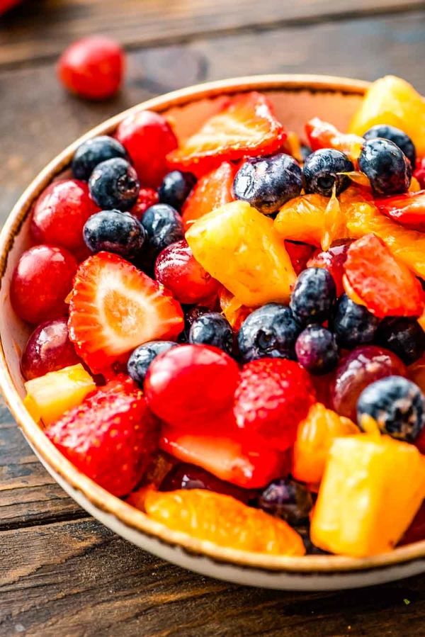 Easy Fruit Salad recipe is made with fresh strawberries, blueberries, grapes, pineapple, raspberries and mandarin oranges. The dressing on it is whipped up using a vanilla pudding mix along with vanilla and almond extract. This is the best fruit salad and it's perfect for entertaining during the summer. Quick, easy and makes a big batch for potlucks, backyard parties and BBQs! It also makes the perfect salad for an easy brunch.