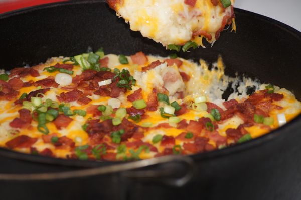 On your camp stove, boil the potatoes until tender. Meanwhile, on your other burner, cook the bacon and set aside on a paper towel. Drain potatoes and mash, adding next eight ingredients. Stir in Parmesan...