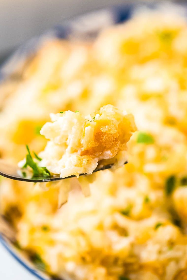 This easy Cheesy Hashbrown Casserole is loaded with cheese and so quick and delicious. It's an easy side dish recipe for any night of the week, but great for serving for holidays or for potlucks! The finishing touch on this Hash Brown Casserole is the buttery Rice Krispies that make it the BEST ever! This recipe is also frequently referred to as "Funeral Potatoes".