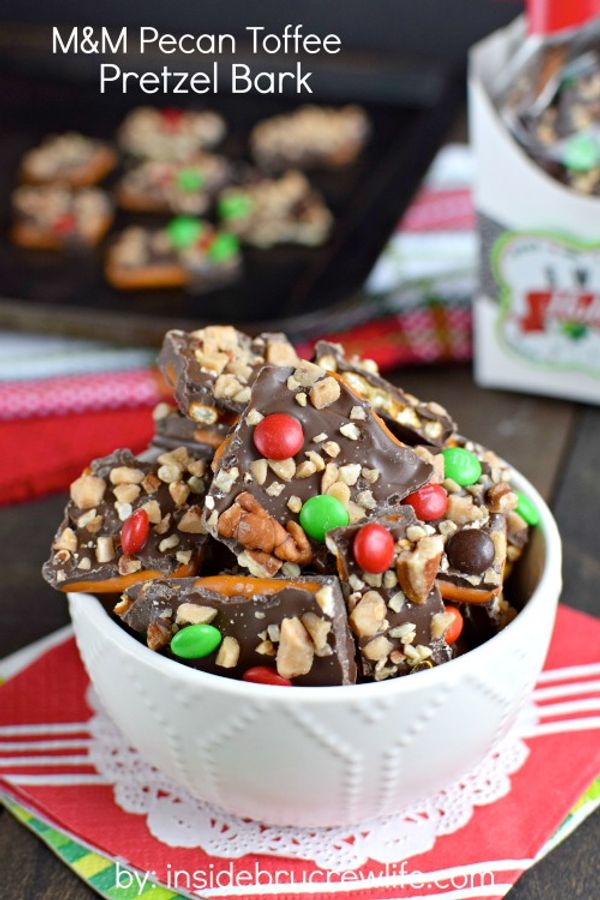 Melt the chocolate according to the package directions. Spread over the top of the pretzels. Sprinkle with the pecan, toffee, and M&M's. Press into...
