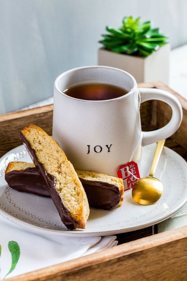 [ad] These biscotti cookies are crisp and crunchy on the edges with a tender crumb in the middle! Dipped in chocolate these Italian cookies are so delightful! Save this easy biscotti recipe for later. PIN IT NOW! #teaproudly #myhotteamonth #CollectiveBias #cookies #Italiancookies #biscotti #almondbiscotti #biscottirecipe #cookierecipes #biscotticookies