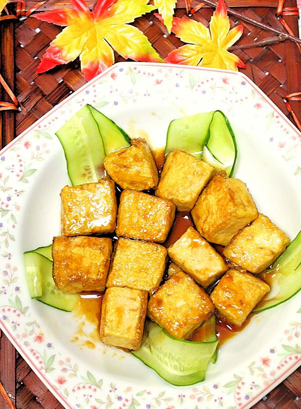 Wrap tofu with a paper towel and put a weight on it to drain well. Cut it bite-sized pieces and flour it with potato starch.
