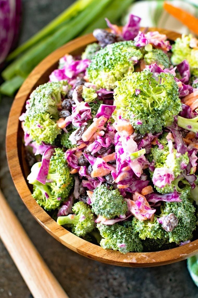- In a large bowl mix together broccoli, red cabbage, sweet onions and raisins. Pour dressing over the top...