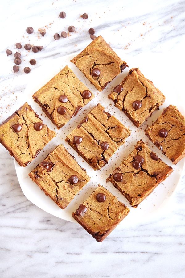 Vegan chocolate chip pumpkin bars are full of perfectly spiced pumpkin and loaded with chocolate chips. Healthy, gluten free and naturally sweet!