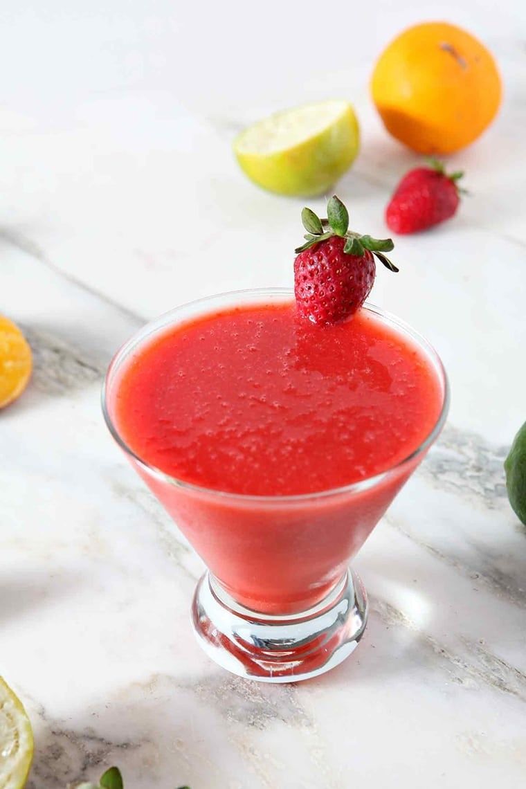 Cool down during the warm weather months by mixing up a Strawberry Virgin Margarita! This booze-free rendition of the beloved margarita has the same sweet-tart kick and packs in the flavor, only calling for five ingredients. Once blended together, serve up Strawberry Virgin Margaritas for friends and family members alike as a cool treat. This vegan mocktail, which can be made Whole30 and paleo-friendly, is sure to become a summertime favorite!