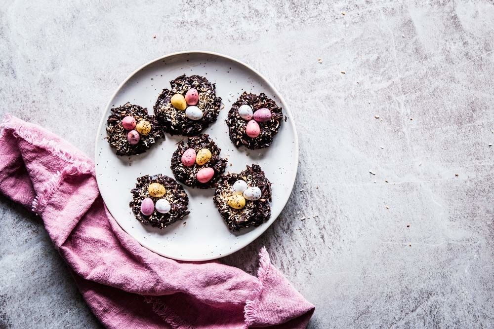 No Bake Bird's Nest Cookies are a fun and cute Easter treat you can make with the kids. These are made with toasted slivered almonds and coconut for a yummy crunchy homemade candy. You can use any chocolate you like - dark, milk or white! Vegan and gluten-free options. Make them for Easter this year!