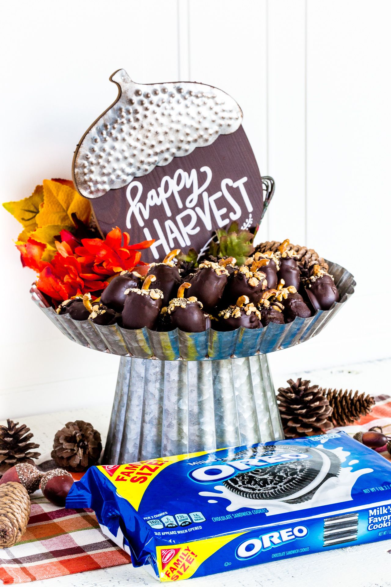 Acorn Oreo Balls are a fun fall tradition! These decadent treats are also known as Oreo truffles or Oreo cookie balls. You'll love how simple they are to make. This must-serve dessert will be a highlight at your next holiday gathering with family and friends. Assemble this easy no-bake recipe in 4 simple steps!