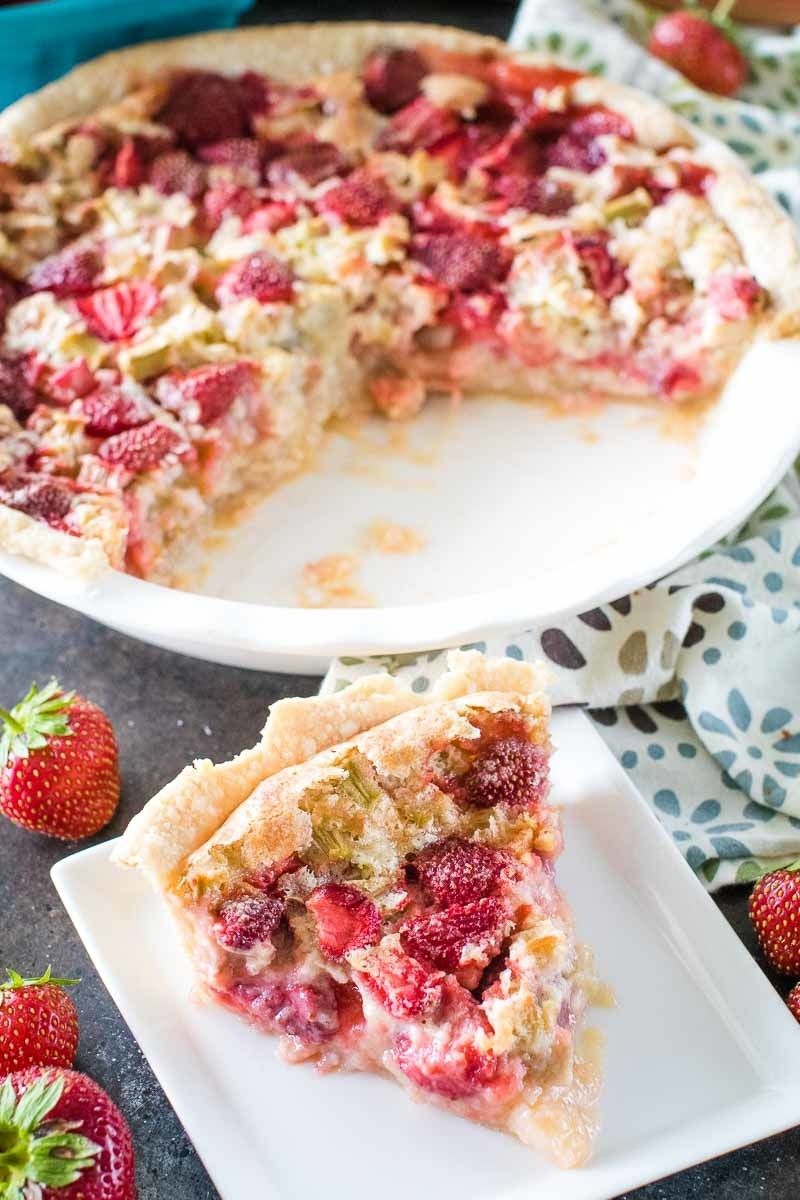 This old-fashioned custard based Strawberry Rhubarb Pie is the BEST pie ever for spring and summer! It's the perfect sweet, tart and tangy combo from the fresh rhubarb and strawberries. This pie is quick and easy and always a crowd pleaser!