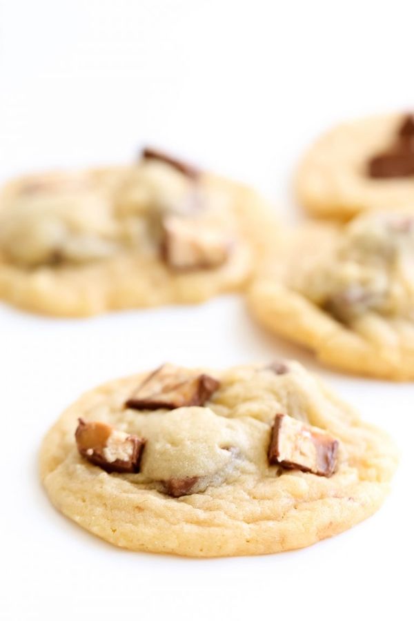 I have always LOVED Snickers candy bars. Those Snickers eggs they have out this time of year? THE BEST. Our Snickers cake? I request it every birthday! And when I saw these Snickers baking bites, they were calling to me to make something delicious with them. I decided they best belonged in a cookie, and we were NOT disappointed!
