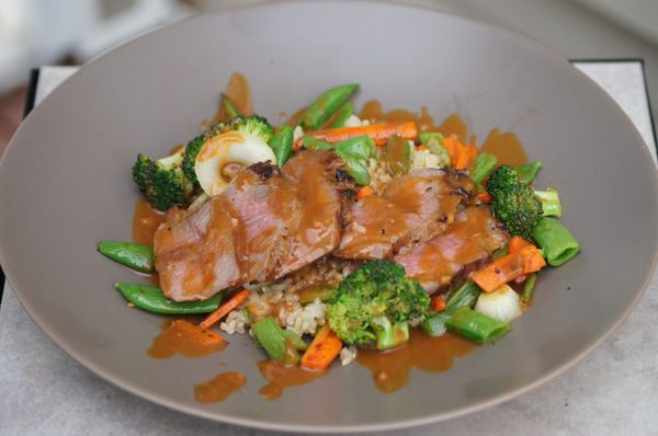 My wife keeps telling me “Why go out to eat when we can make it better here at home?” So a few nights ago we were in the mood for something really good with lots of flavor and landed on an Island Rice Bowl with a fantastic peanut sauce. We used zucchini, carrot, onion, sugar peas and broccoli, but you can choose what ever vegetables are your own personal favorite. Add grilled chicken (we did), steak or shrimp. Omit meat for a wonderful vegetarian dish. Top it all off with sauce.