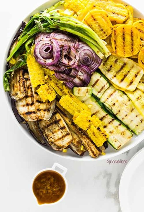 This healthy grilling recipe is packed with all of summer's veggies like yellow beets, zucchini, yellow squash, red onion, eggplant, scallions and corn. It has a flavorful black olive tapenade vinaigrette full of Mediterranean flavors.