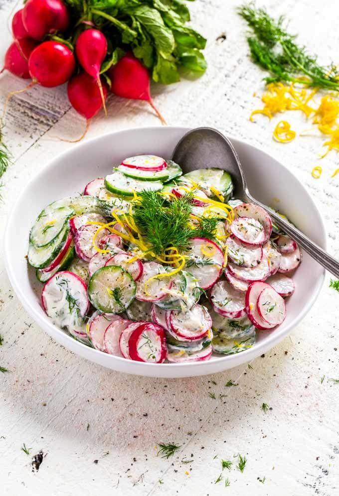 This creamy cucumber salad is made with a delicious dill dressing that boasts a bright flavor profile. Accented with radishes and lemon zest, this colorful side dish is the perfect choice for backyard BBQs, picnics and potlucks. Assemble this summer salad in just 15 minutes!