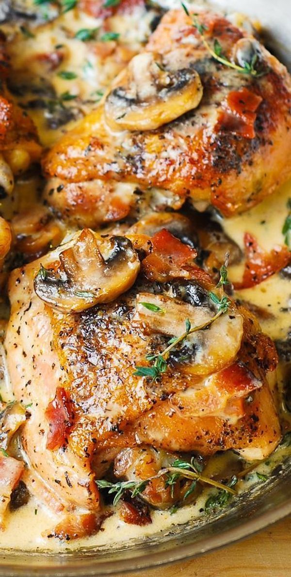 Chicken Thighs with Creamy Bacon Mushroom Thyme Sauce - Special Food