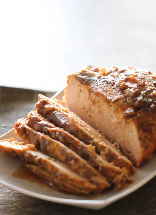 Place turkey breast in a slow cooker sprayed with nonstick cooking spray and pour prepared sauce on top.